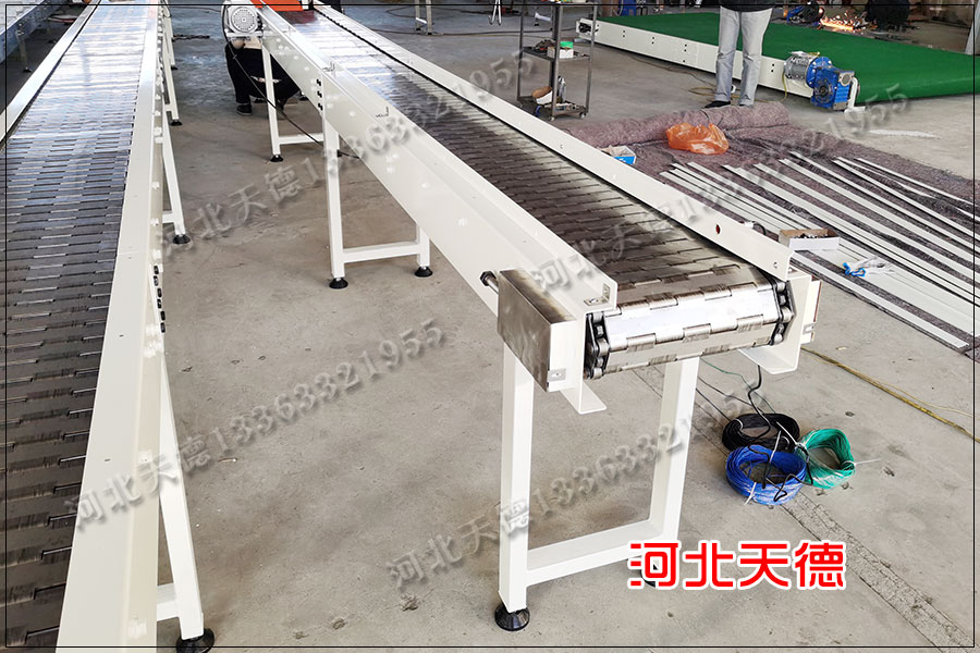 1)板鏈?zhǔn)窖b配流水線(鏈板輸送機)特點:承載的產(chǎn)品比較重,和生產(chǎn)線同步運行,可以實現(xiàn)產(chǎn)品的爬坡;生產(chǎn)的節(jié)拍不是很快;以鏈板面作為承載,可以實現(xiàn)產(chǎn)品的平穩(wěn)輸送。