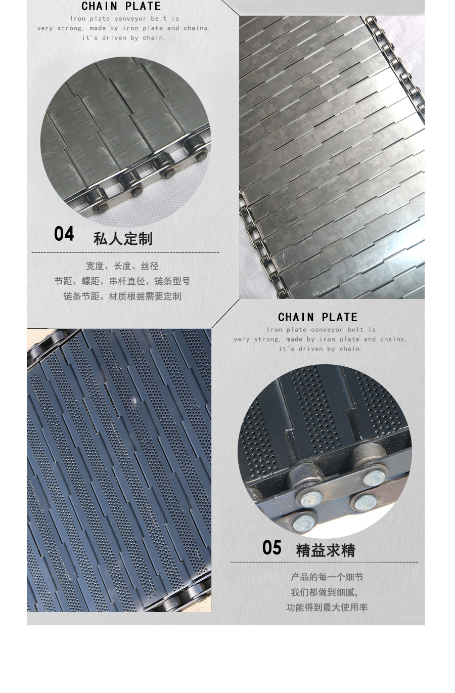 鏈板輸送帶:是采用不銹鋼板沖壓成型,鏈條傳動,每節(jié)由6-10mm支撐桿連接,其運動平穩(wěn)、力量大,適合用于輸送細小的高密度物件,輸送過程中運轉平穩(wěn),安裝更換方便,成本高,使用壽命較長。