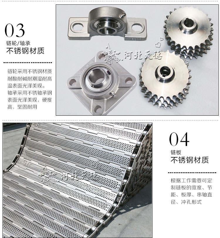 作為合頁(yè)鏈板輸送機(jī)使用的大市場(chǎng)就是速凍領(lǐng)域,速凍領(lǐng)域中果蔬速凍可以說是多的使用行業(yè)。果蔬速凍所使用的鏈板式輸送機(jī)規(guī)格型號(hào)比較常規(guī),全部304或316不銹鋼結(jié)構(gòu);節(jié)距31.75mm或38.1mm;厚度1mm~1.5mm;寬度300mm-900mm;一般沖孔3mm~4mm,這種規(guī)格的鏈板輸送機(jī)適應(yīng)果蔬的輸送和速凍作業(yè)。