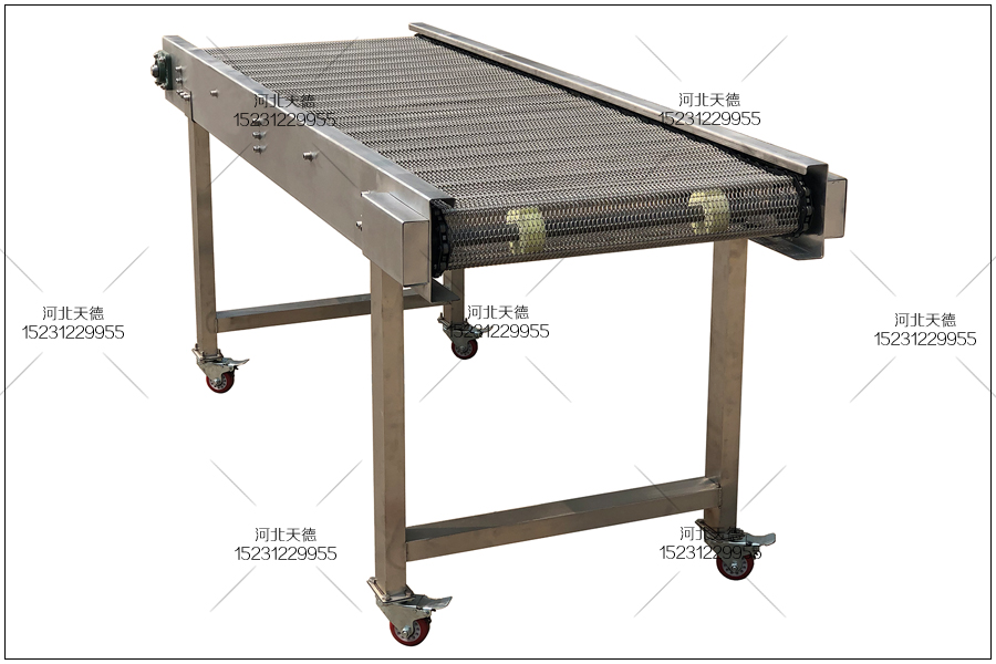 該不銹鋼輸送機(jī)總長為1.5米,總寬度為500毫米,高度為60公分,采用鏈條式不銹鋼輸送帶來傳送物品,采用1.2鋼絲編織的10*20的孔,鏈條節(jié)距采用31.75毫米,使用直徑6毫米的串桿來支撐物料的輸送。大概120毫米左右一個串桿。